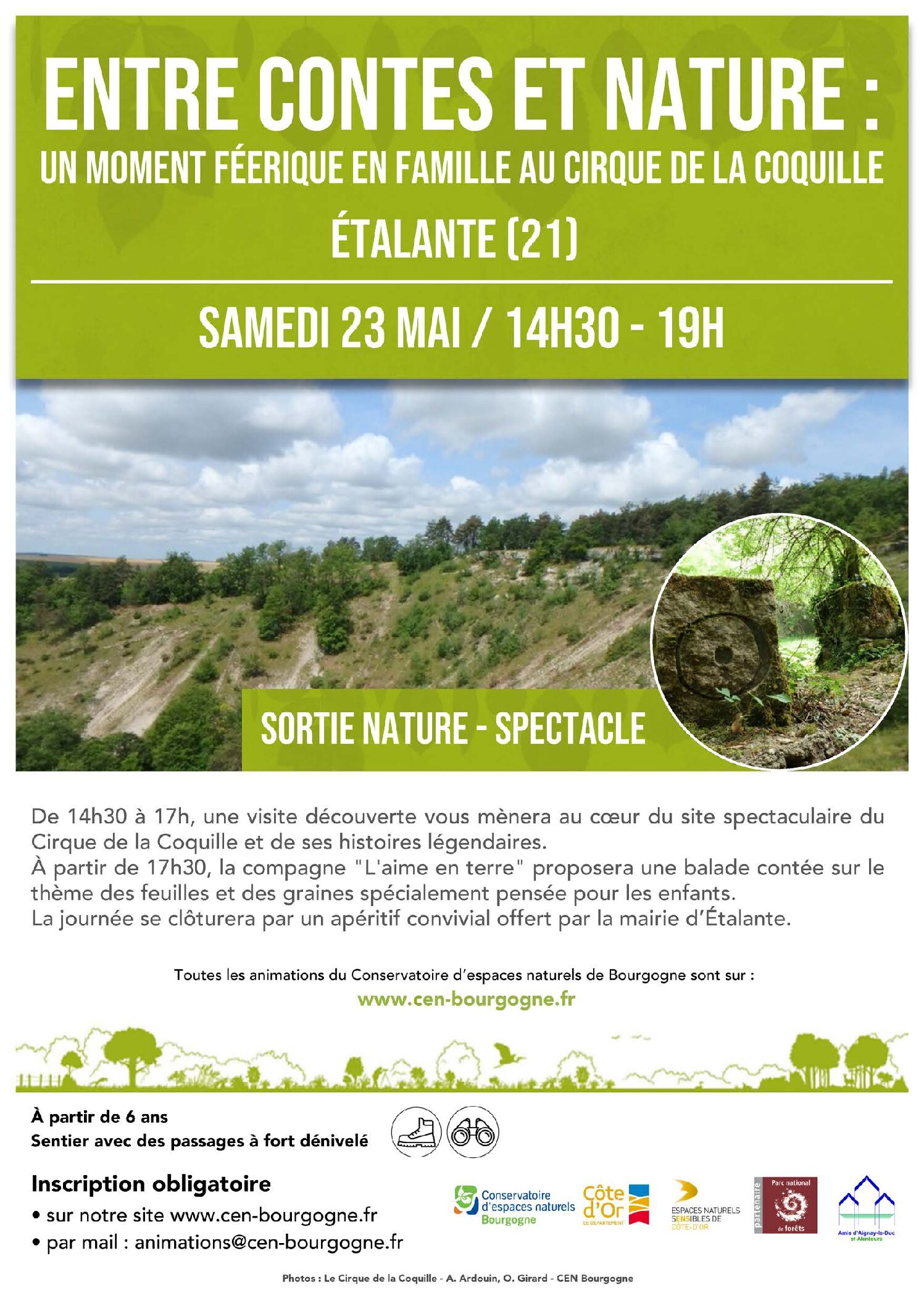 En partenariat avec le Conservatoire d’espaces naturels de Bourgogne, visite guidée du cirque de la Coquille (bien se chausser, sentier à fort dénivelé), puis balade contée avec la compagnie “L’aime en terre”. Apéritif offert par la mairie d’Etalante. Inscriptions voir affiche. Gratuit.
